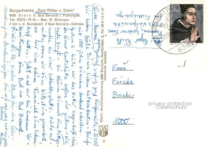 73791322 alte Postkarte Stein Bad Berneck Burgschenke Zum Ritter vom Stein Freiterrasse postalisch gelaufen Erhaltung siehe scans [WerneD78] KatCode: 11110009472116
