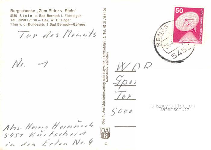 72741806 alte Postkarte Stein Bad Berneck Burgschenke Zum Ritter von Stein Terrasse postalisch gelaufen Erhaltung siehe scans [WerneD78] KatCode: 11110009472116