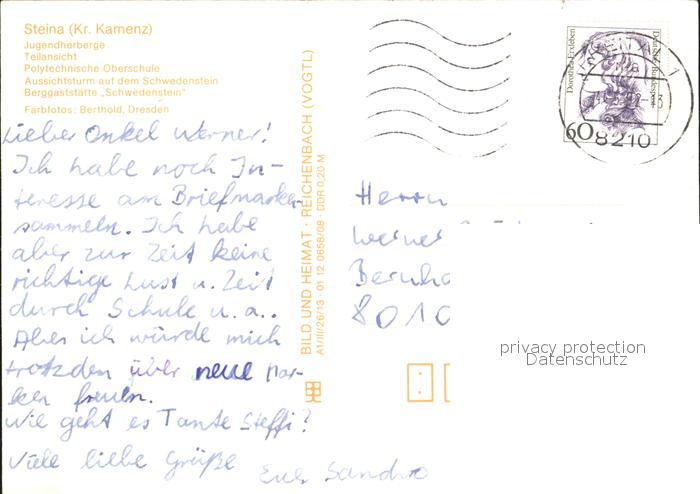 72356005 alte Postkarte Steina Pulsnitz Jugendherberge Teilansicht Polytechnische Oberschule Aussichtsturm Schwedenstein Berggaststaette postalisch gelaufen Erhaltung siehe scans KatCode: 11110014292540