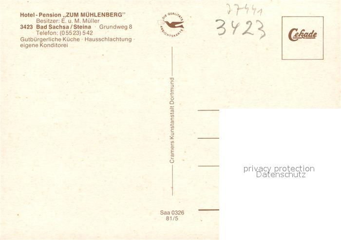 73569301 Steina S?dharz Hotel-Pension Zum M?hlenberg postalisch nicht gelaufen Erhaltung siehe scans [PaolaD17] KatCode: