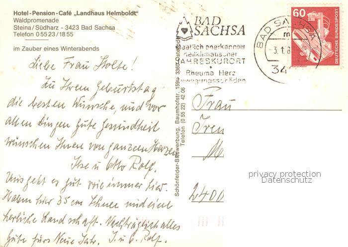 73712700 alte Postkarte Steina Suedharz Hotel Pension Cafe Landhaus Helmboldt im Zauber eines Winterabends postalisch gelaufen Erhaltung siehe scans [FriedD77] KatCode: 11110003156003