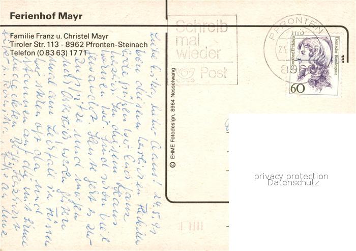 73109106 alte Postkarte Steinach Pfronten Ferienhof Mayr postalisch gelaufen Erhaltung siehe scans [KathaD81] KatCode: 11110009777159
