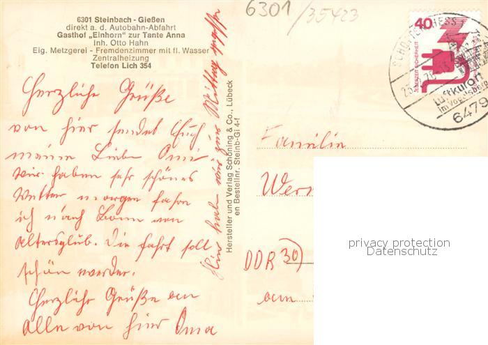 73864955 alte Postkarte Steinbach Giessen Gasthof Einhorn zur Tante Anna Gaststube Ortsansicht postalisch gelaufen Erhaltung siehe scans [WerneD78] KatCode: 11110006531004