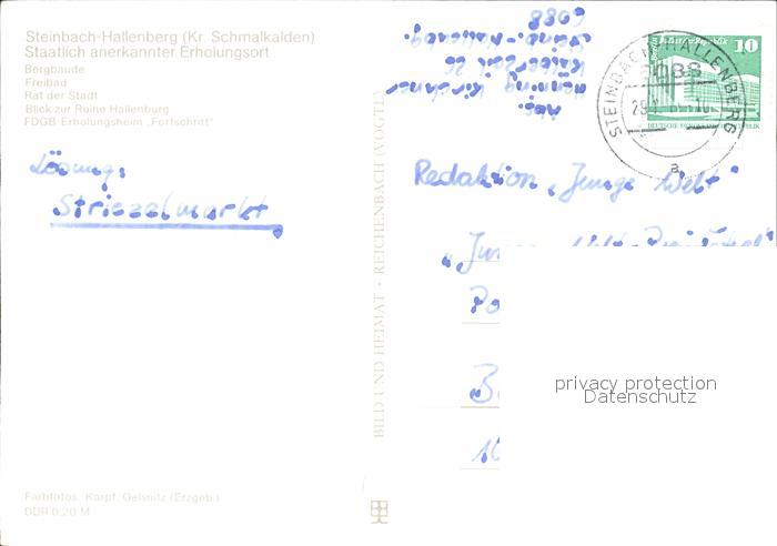72135881 alte Postkarte Steinbach-Hallenberg Bergbaude Freibad Rat der Stadt Ruine FDGB Erholungsheim Fortschritt postalisch gelaufen Erhaltung siehe scans KatCode: 11110016066063