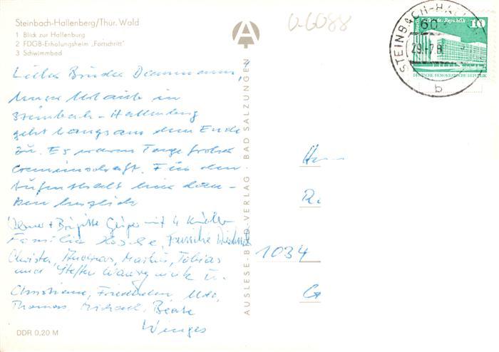 73943483 alte Postkarte Steinbach Hallenberg Hallenburg FDGB Erholungsheim Fortschritt Schwimmbad postalisch gelaufen Erhaltung siehe scans [WerneD78] KatCode: 11110016066063