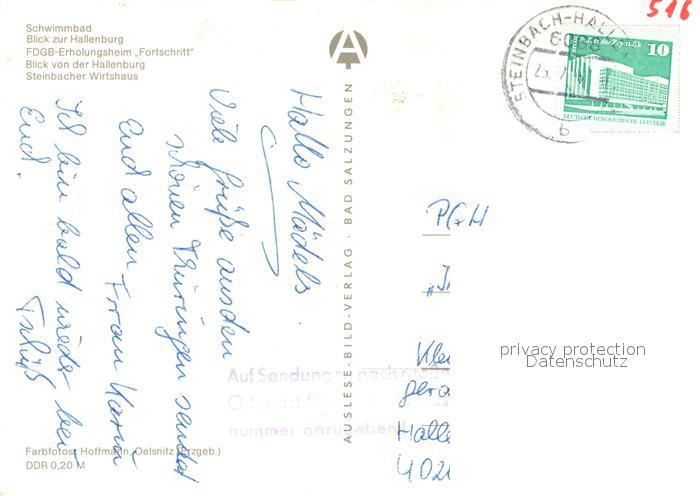 73652175 alte Postkarte Steinbach Hallenberg Schwimmbad Hallenburg FDGB Erholungsheim Fortschritt Blick von der Hallenburg Steinbacher Wirtshaus postalisch gelaufen Erhaltung siehe scans [WerneD78] KatCode: 11110016066063