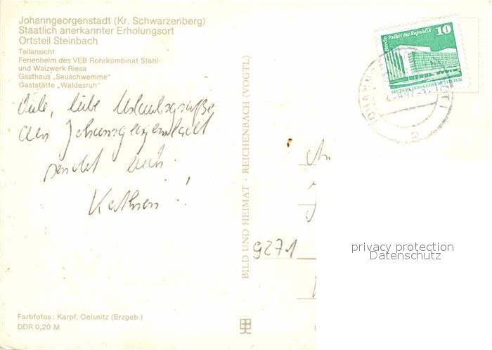 72617392 alte Postkarte Steinbach Johanngeorgenstadt Teilansicht Ferienheim des VEB Rohrkombinat Riesa Gasthaus Sauschwemme Gaststaette Waldesruh postalisch gelaufen Erhaltung siehe scans [WerneD78] KatCode: 11110014191180