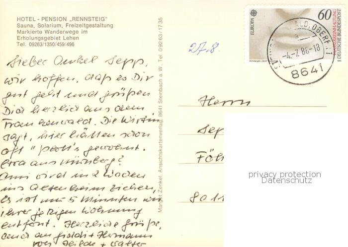 73780318 alte Postkarte Steinbach Kronach Hotel Pension Rennsteig Cafe Fiedler postalisch gelaufen Erhaltung siehe scans [FriedD77] KatCode: 11110009476175