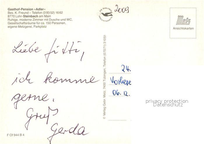 73647928 Steinbach Lohr Main Gasthof Pension Adler postalisch nicht gelaufen Erhaltung siehe scans [WerneD78] KatCode: 11110009677155