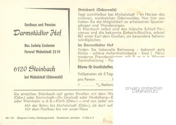 73649215 Steinbach Michelstadt Gasthaus Pension Darmstaedter Hof Gastraum Bruecke Wehr postalisch nicht gelaufen Werbekarte (keine Postkarte) Erhaltung siehe scans [FriedD77] KatCode: 11110006437011