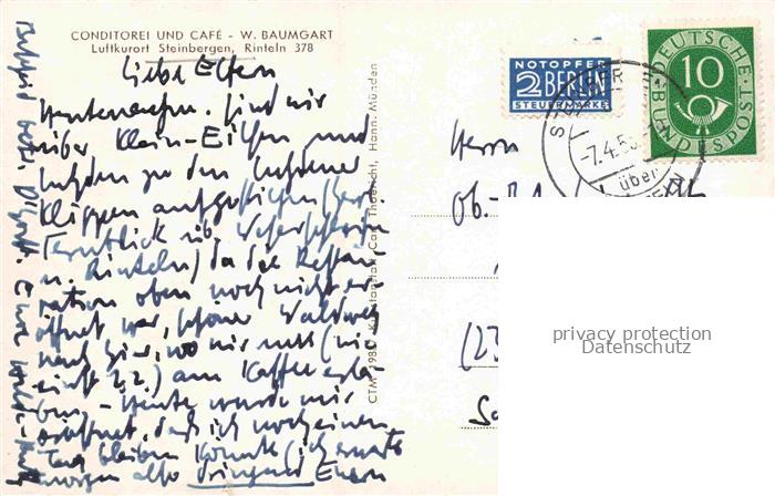 34144962 alte Postkarte Steinbergen Rinteln Niedersachsen Conditorei Cafe Baumgart postalisch gelaufen Erhaltung siehe scans [WerneD78] KatCode: 11110003257031