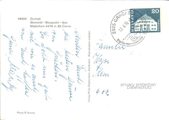 alte Postkarte Steinbock Zermatt Steinwild Matterhorn postalisch gelaufen Erhaltung siehe scans