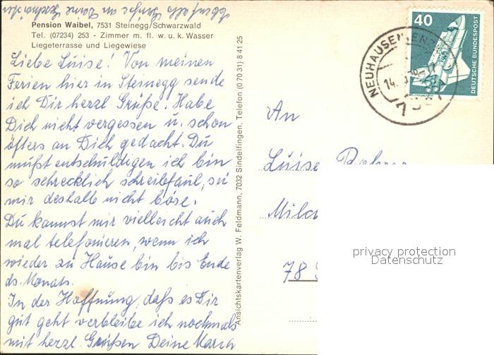 72062457 alte Postkarte Steinegg Enzkreis Pension Waibel postalisch gelaufen Erhaltung siehe scans KatCode: 11110008236044