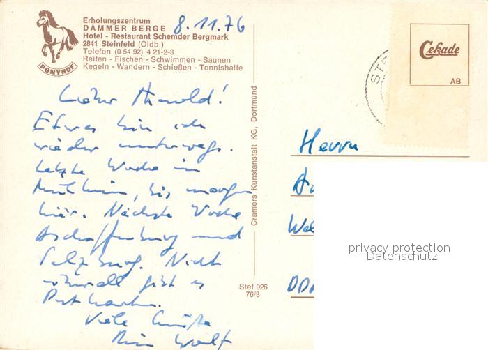 73651154 alte Postkarte Steinfeld Oldenburg Erholungszentrum Dammer Berge Hotel Restaurant Schemder Bergmark Hallenbad Ponyhof postalisch gelaufen Erhaltung siehe scans [FriedD77] KatCode: 11110003460008