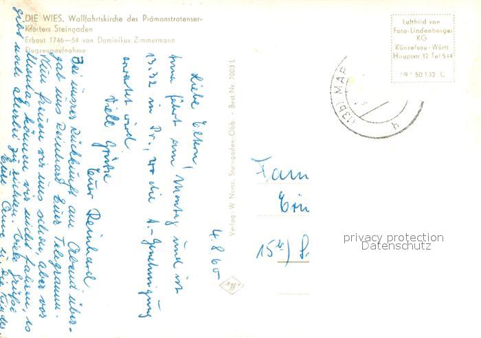 73720222 alte Postkarte Steingaden Oberbayern Die Wies Wallfahrtskirche des Praemonstratenserklosters postalisch gelaufen Fliegeraufnahme Erhaltung siehe scans [FriedD77] KatCode: 11110009190154