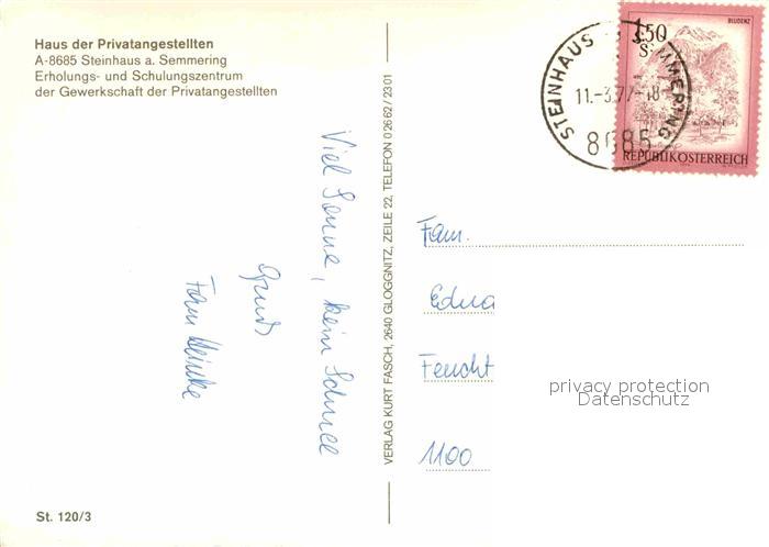 72900203 alte Postkarte Steinhaus Semmering Haus der Privatangestellten postalisch gelaufen Erhaltung siehe scans [LiesaD40] KatCode: 11390122031838