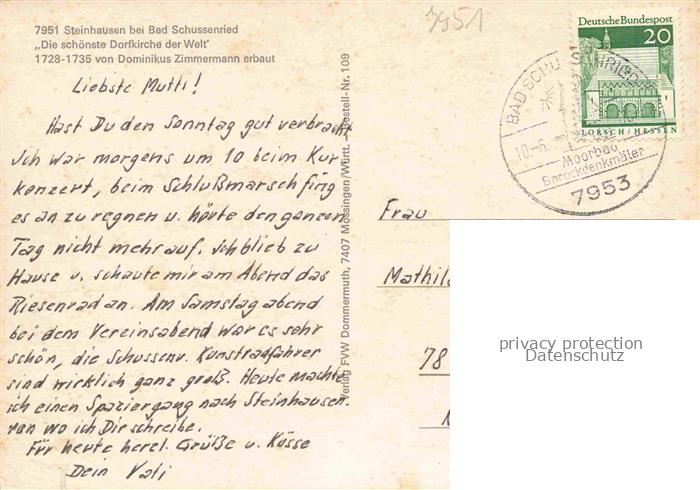 74050788 alte Postkarte Steinhausen Bad Schussenried Schoene Dorfkirche postalisch gelaufen Erhaltung siehe scans [WerneD78] KatCode: 11110008426014