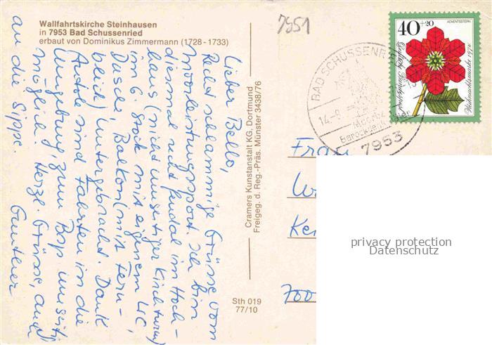 74052852 alte Postkarte Steinhausen Bad Schussenried Wallfahrtskirche postalisch gelaufen Fliegeraufnahme Erhaltung siehe scans [FriedD77] KatCode: 11110008426014
