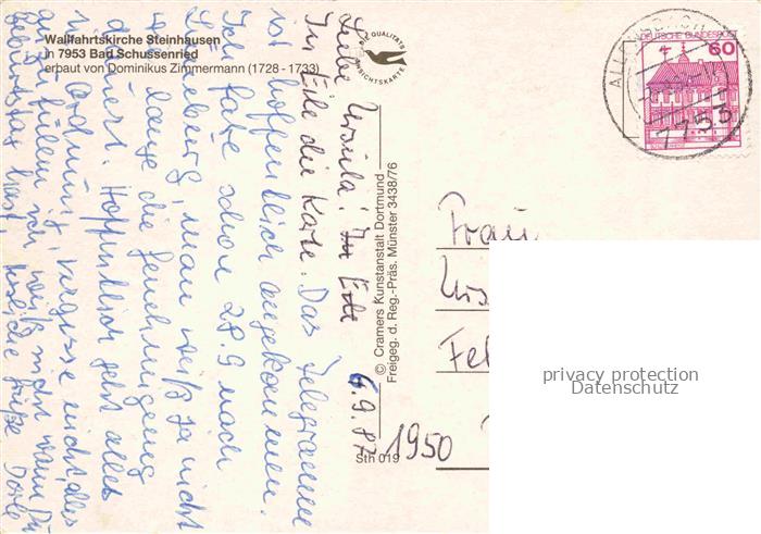 74026342 alte Postkarte Steinhausen Bad Schussenried Wallfahrtskirche Erbauer Dominikus Zimmermann 18. Jhdt. postalisch gelaufen Fliegeraufnahme Erhaltung siehe scans [FriedD77] KatCode: 11110008426014