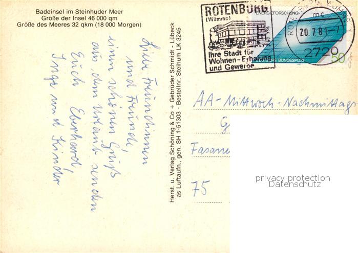 73062789 alte Postkarte Steinhude Fliegeraufnahme Badeinsel postalisch gelaufen Erhaltung siehe scans [KathaD81] KatCode: 11110003241021