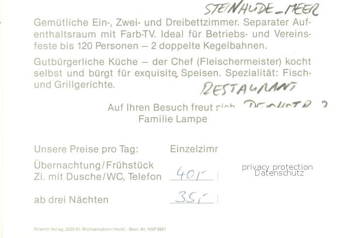 73323223 Steinhude Restaurant Deichstrasse postalisch nicht gelaufen Werbekarte (keine Postkarte) Erhaltung siehe scans [FriedD77] KatCode: 11110003241021