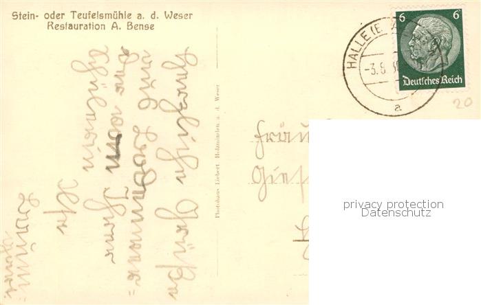 73812092 alte Postkarte Steinmuehle Pegestorf Wesertal Blick ins Wesertal mit Stein oder Teufelsmuehle an der Weser postalisch gelaufen Erhaltung siehe scans [WerneD78] KatCode: 11110003255032