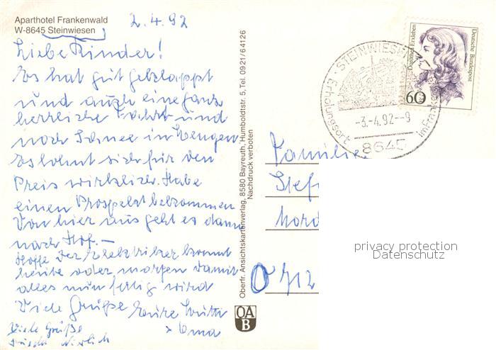 73786986 alte Postkarte Steinwiesen Aparthotel Frankenwald postalisch gelaufen Erhaltung siehe scans [FriedD77] KatCode: 11110009476177