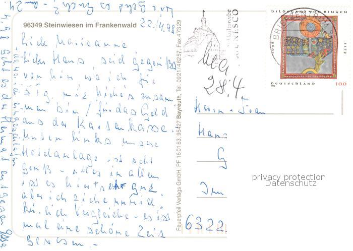 73214903 alte Postkarte Steinwiesen Teilansichten Freibad Denkmal postalisch gelaufen Erhaltung siehe scans [FriedD77] KatCode: 11110009476177