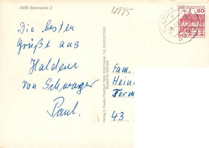 73896220 alte Postkarte Stemwede Kirche Westf Klinik Schloss Haldem Gemeindezentrum Fachwerkhaus postalisch gelaufen Erhaltung siehe scans [WerneD78] KatCode: 11110005770044
