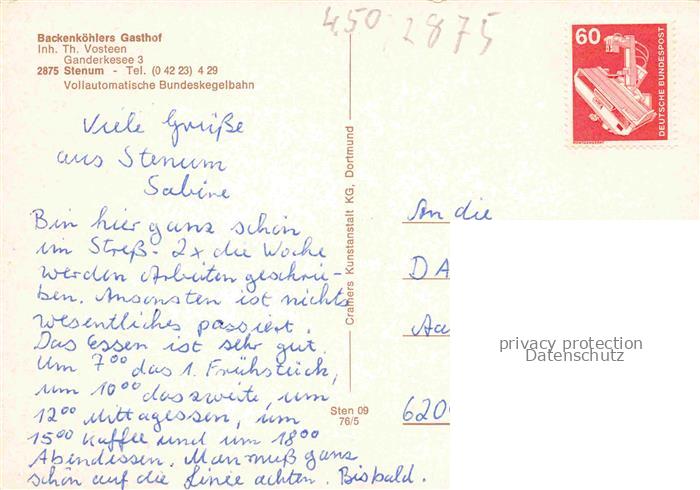 74152245 Stenum Ganderkesee Oldenburg Niedersachsen Backenkoehlers Gasthof Gaestehaus postalisch nicht gelaufen Erhaltung siehe scans [WerneD78] KatCode: 11110003458005