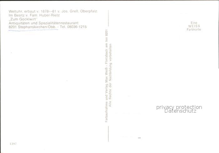 72366972 Stephanskirchen Simssee Weltuhr erbaut 19. Jhdt. Jos. Gress Restaurant Zum Goecklwirt postalisch nicht gelaufen Erhaltung siehe scans KatCode: 11110009187177