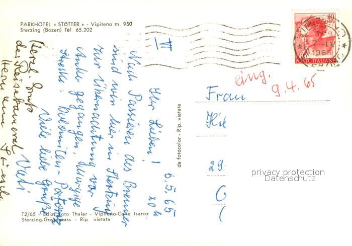 13657912 Sterzing Suedtirol Parkhotel Stoetter postalisch gelaufen Erhaltung siehe scans [WerneD78] old postcard Wern Katcode 11240