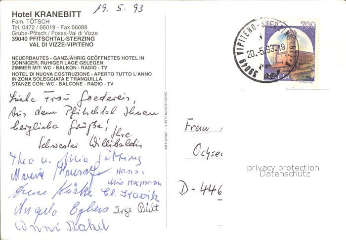 old postcard Sterzing Suedtirol Pfitschtal Hotel Kranebitt postalisch gelaufen Erhaltung siehe scans