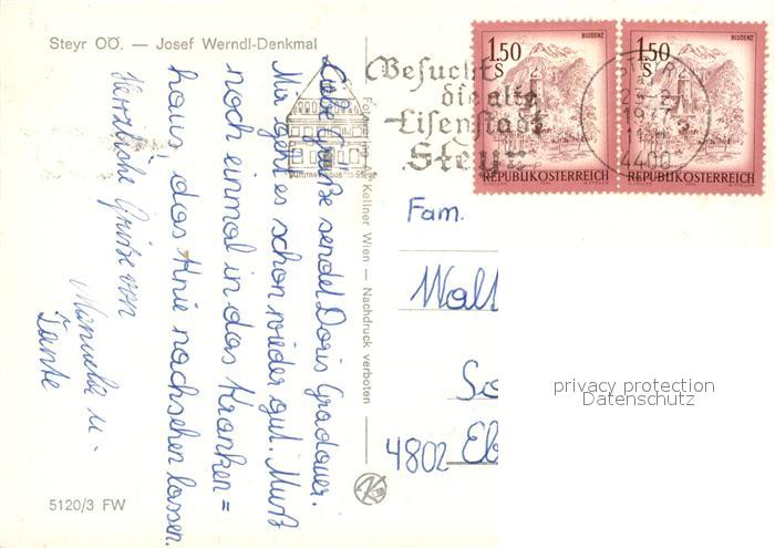 73285213 alte Postkarte Steyr Enns Oberoesterreich Josef Werndl-Denkmal postalisch gelaufen Erhaltung siehe scans [NatalD47] KatCode: 11390314040201