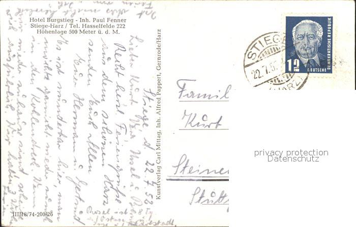31721768 alte Postkarte Stiege Hotel Burgstieg Paul Fenner postalisch gelaufen Erhaltung siehe scans KatCode: 11110015085310