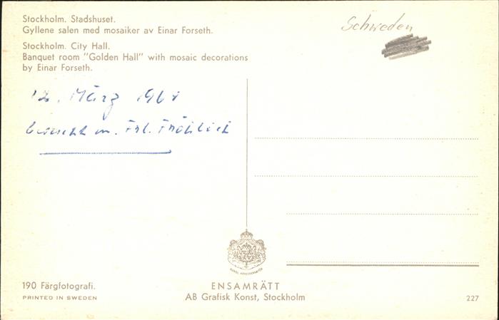old postcard Stockholm City Hall Banquet Room postalisch gelaufen gute Erhaltung