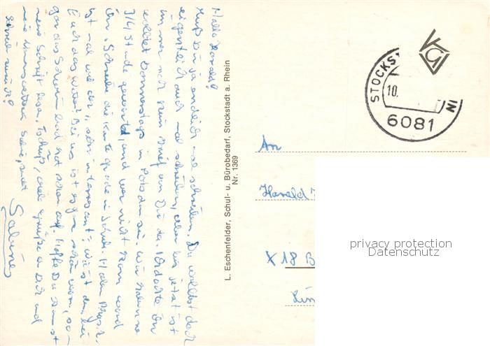 73852258 alte Postkarte Stockstadt Kirche Neubaugebiet Kindergarten Schwimmbad Schule Althrein postalisch gelaufen Erhaltung siehe scans [FriedD77] KatCode: 11110006433013