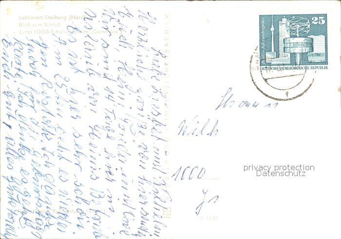 72080152 alte Postkarte Stolberg Harz Blick zum Schloss jetzt FDGB Erholungsheim Comenius postalisch gelaufen Erhaltung siehe scans KatCode: 11110015087410