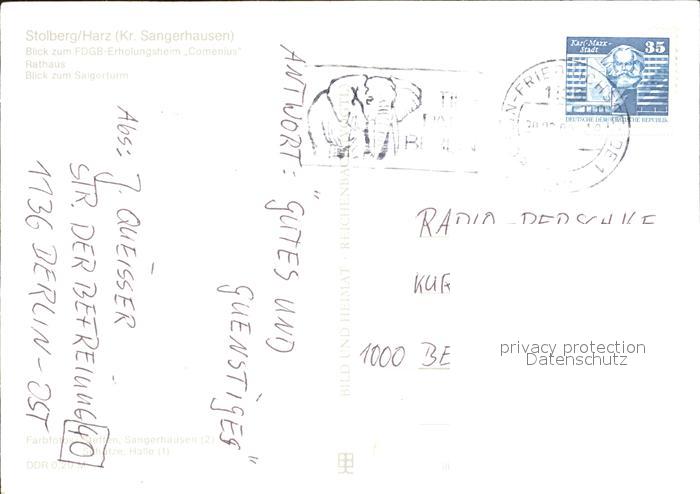 72375661 alte Postkarte Stolberg Harz Erholungsheim Comenius Blick zum Saigerturm Rathaus postalisch gelaufen Erhaltung siehe scans KatCode: 11110015087410
