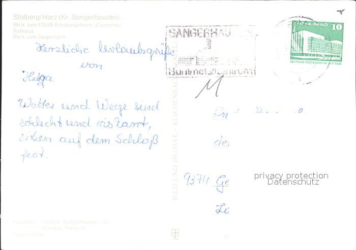 72304561 alte Postkarte Stolberg Harz FDGB Erholungsheim Comenius Rathaus postalisch gelaufen Erhaltung siehe scans KatCode: 11110015087410