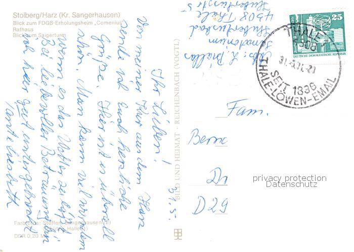 72945855 alte Postkarte Stolberg Harz FDGB Erholungsheim Comenius Rathaus Saigerturm postalisch gelaufen Erhaltung siehe scans [WerneD78] KatCode: 11110015087410