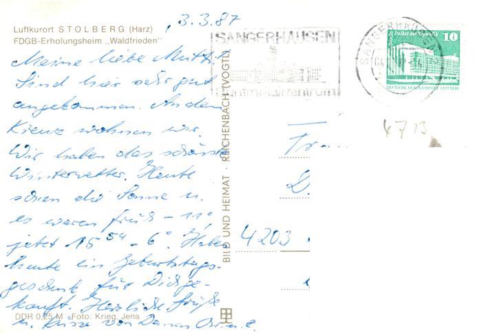 73882878 alte Postkarte Stolberg Harz FDGB Erholungsheim Waldfrieden postalisch gelaufen Erhaltung siehe scans [WerneD78] KatCode: 11110015087410
