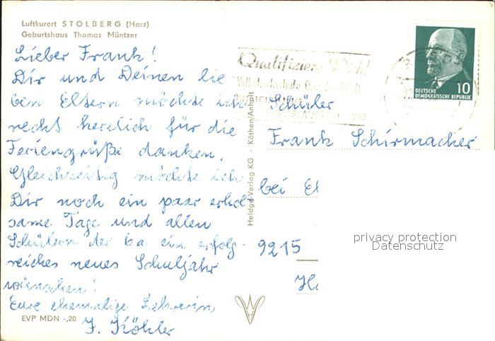 72473616 alte Postkarte Stolberg Harz Geburtshaus Thomas Muentzer Luftkurort postalisch gelaufen Erhaltung siehe scans KatCode: 11110015087410