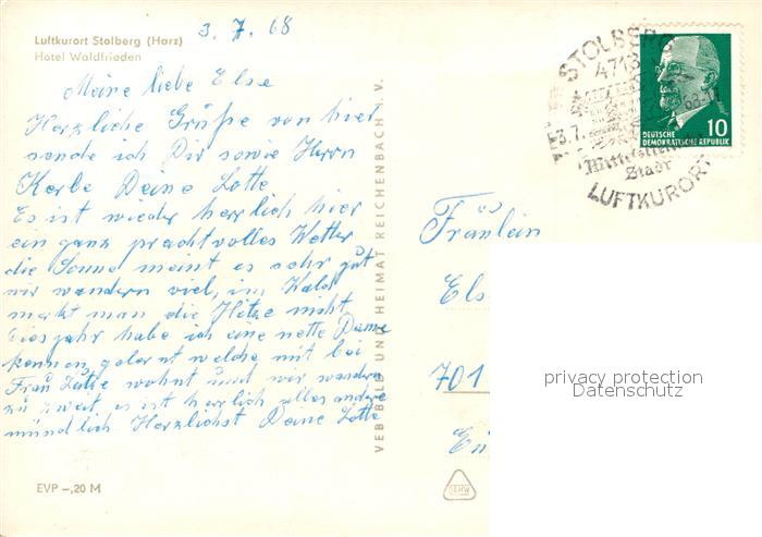 72927404 alte Postkarte Stolberg Harz Hotel Waldfrieden postalisch gelaufen Erhaltung siehe scans [LiesaD40] KatCode: 11110015087410