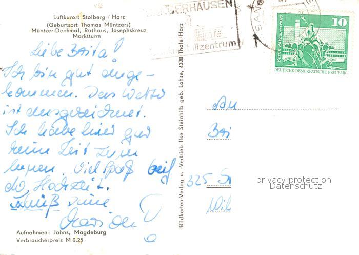 73135147 alte Postkarte Stolberg Harz Muentzer Denkmal Rathaus Josephskreuz Marktturm postalisch gelaufen Erhaltung siehe scans [FriedD77] KatCode: 11110015087410