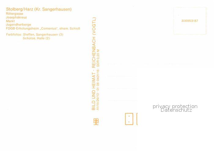 72700639 Stolberg Harz Rittergasse Josephskreuz Markt Jugendherberge FDGB Erholungsheim Comenius ehem Schloss postalisch nicht gelaufen Erhaltung siehe scans [WerneD78] KatCode: 11110015087410