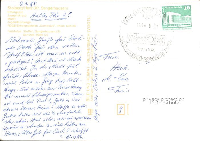 72320017 alte Postkarte Stolberg Harz Rittergasse Josepskreuz Markt Schloss postalisch gelaufen Erhaltung siehe scans KatCode: 11110015087410
