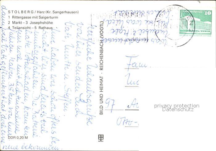 72335928 alte Postkarte Stolberg Harz Rittergasse Saigerturm Markt Josephshoehe Teilansicht Rathaus postalisch gelaufen Erhaltung siehe scans KatCode: 11110015087410