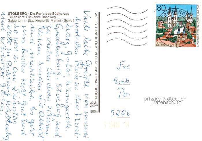 73268038 alte Postkarte Stolberg Harz Saigerturm Schloss Kirche postalisch gelaufen Erhaltung siehe scans [LiesaD40] KatCode: 11110015087410