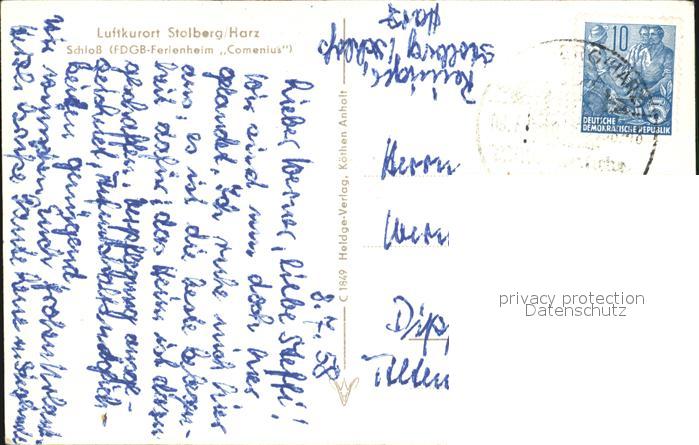 72472867 alte Postkarte Stolberg Harz Schloss FDGB Ferienheim Comenius Luftkurort postalisch gelaufen Erhaltung siehe scans KatCode: 11110015087410